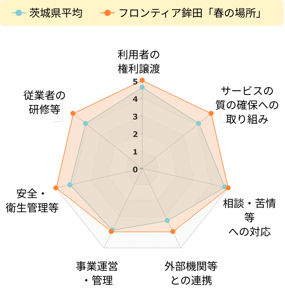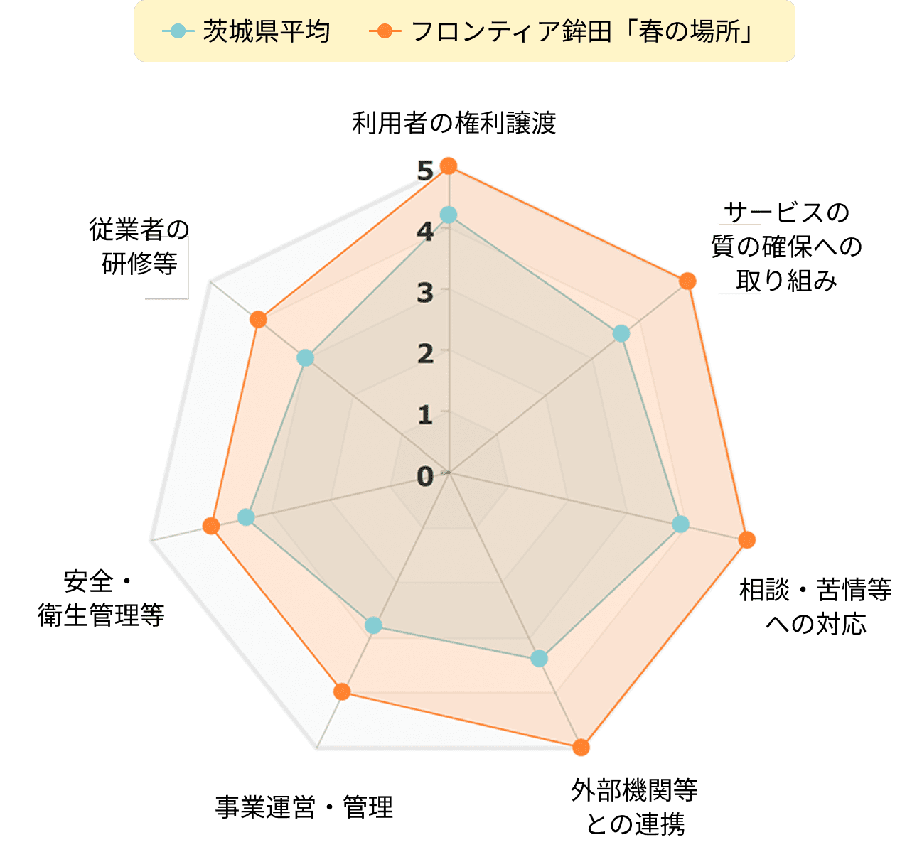 利用者の権利擁護、サービスの質の確保への取り組み、外部機関との連携、従業者への研修、安全・衛生管理など、7つの品質評価区分すべてにおいて高い水準を維持しており、茨城県の平均評価を大きく上回っています。サービス品質の改善を常に図り、マニュアル化や研修実施を推進しています。