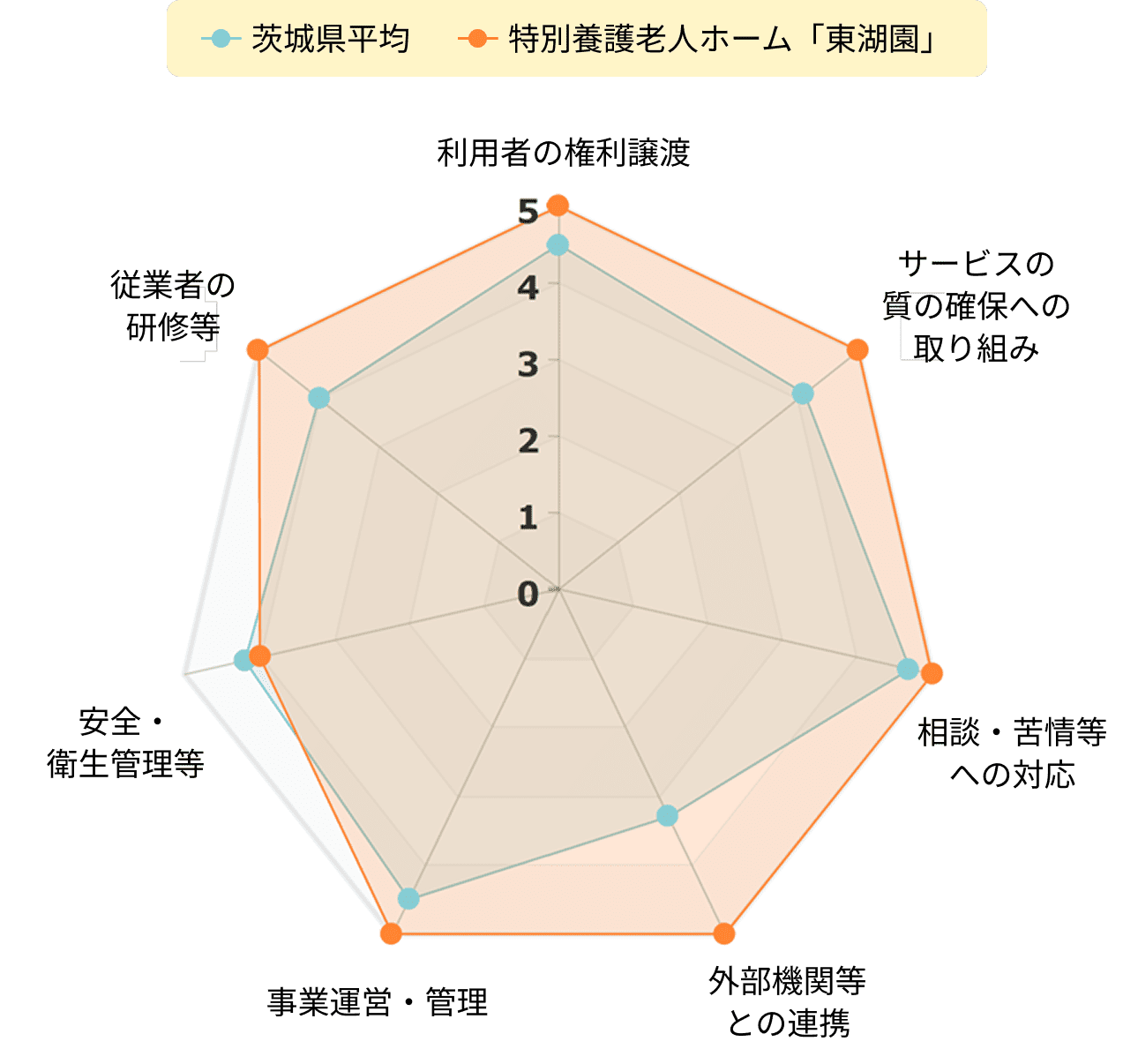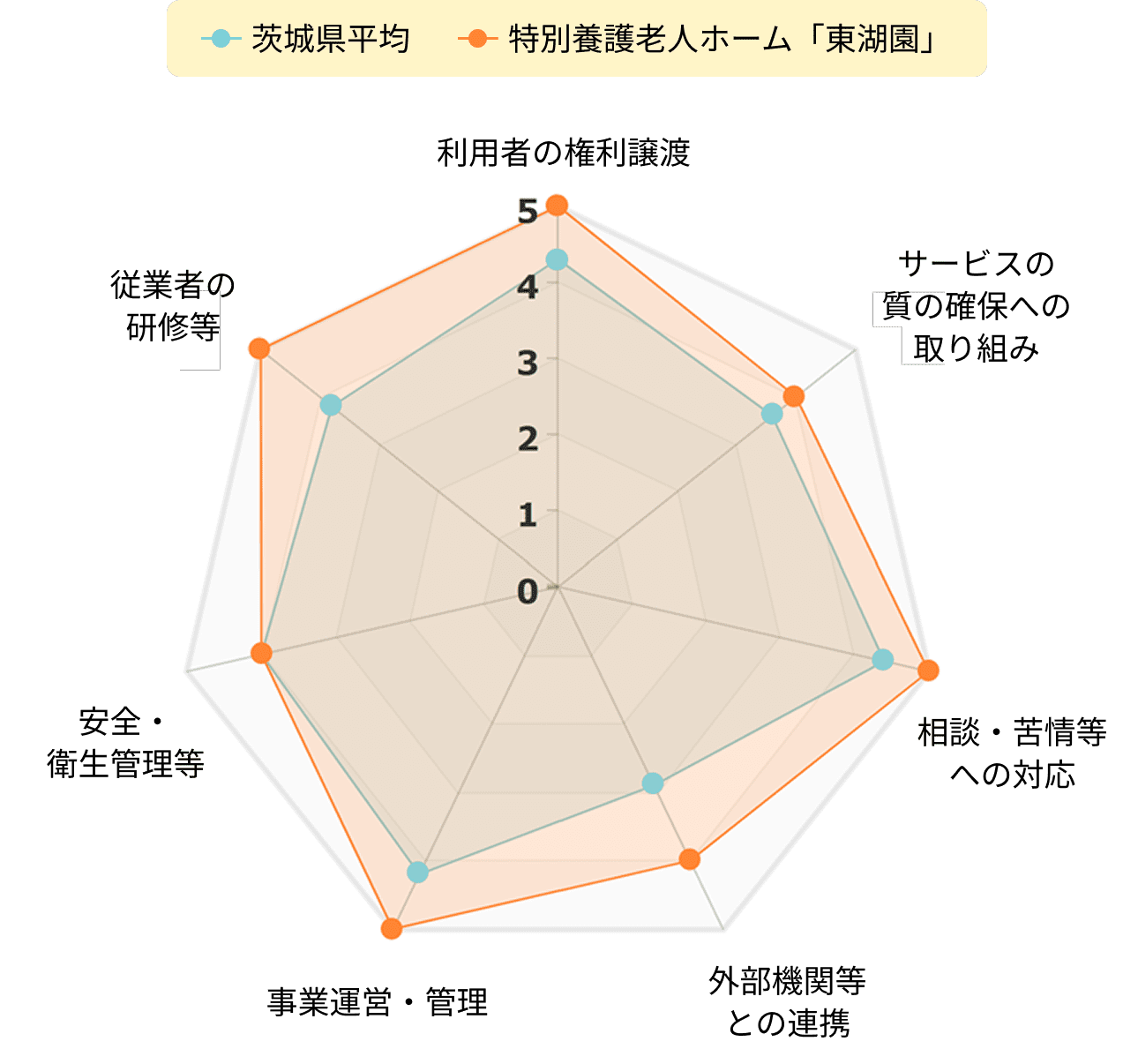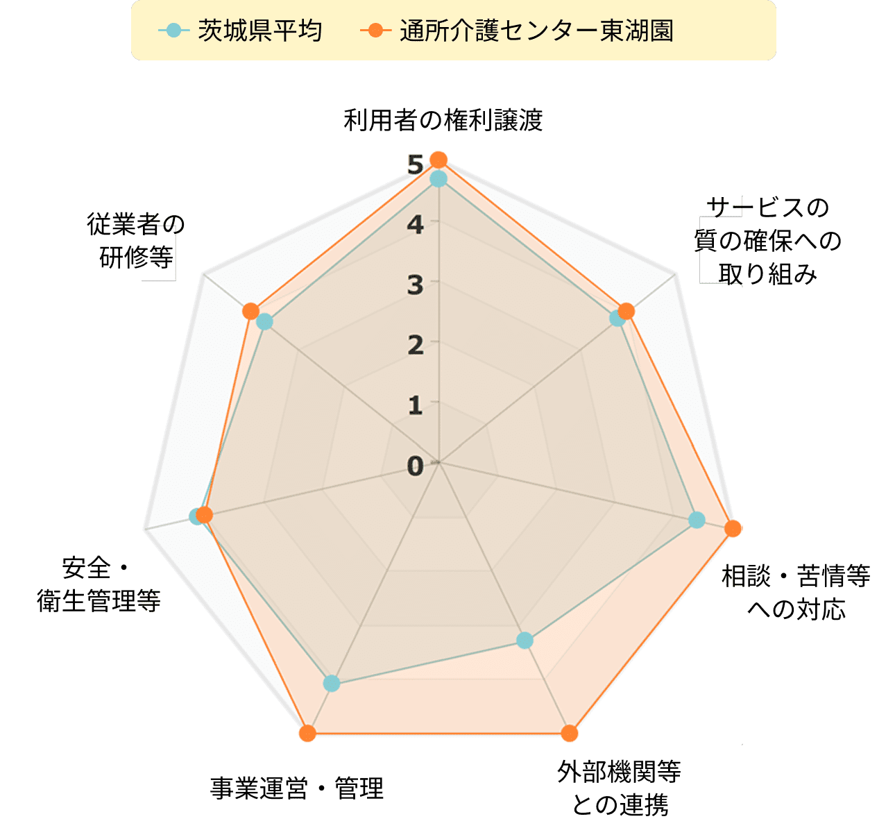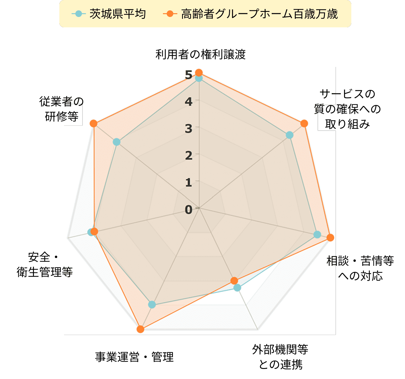 利用者の権利擁護、サービスの質の確保への取り組み、外部機関との連携、従業者への研修、安全・衛生管理など、7つの品質評価区分すべてにおいて高い水準を維持しており、茨城県の平均評価を大きく上回っています。サービス品質の改善を常に図り、マニュアル化や研修実施を推進しています。