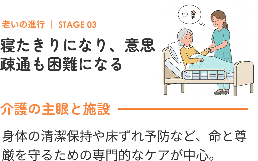 24時間体制での病状観察、服薬管理、医療的処置などを担当し、医療面での安全を支えます。(介護医療院のほうがより高度な医療ケアが可能です。)